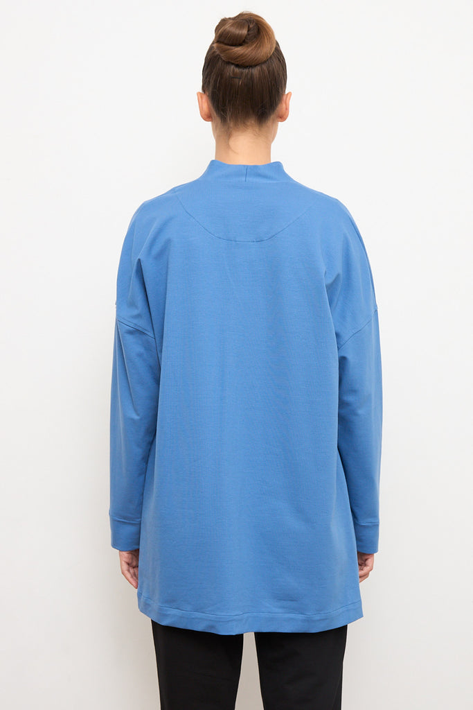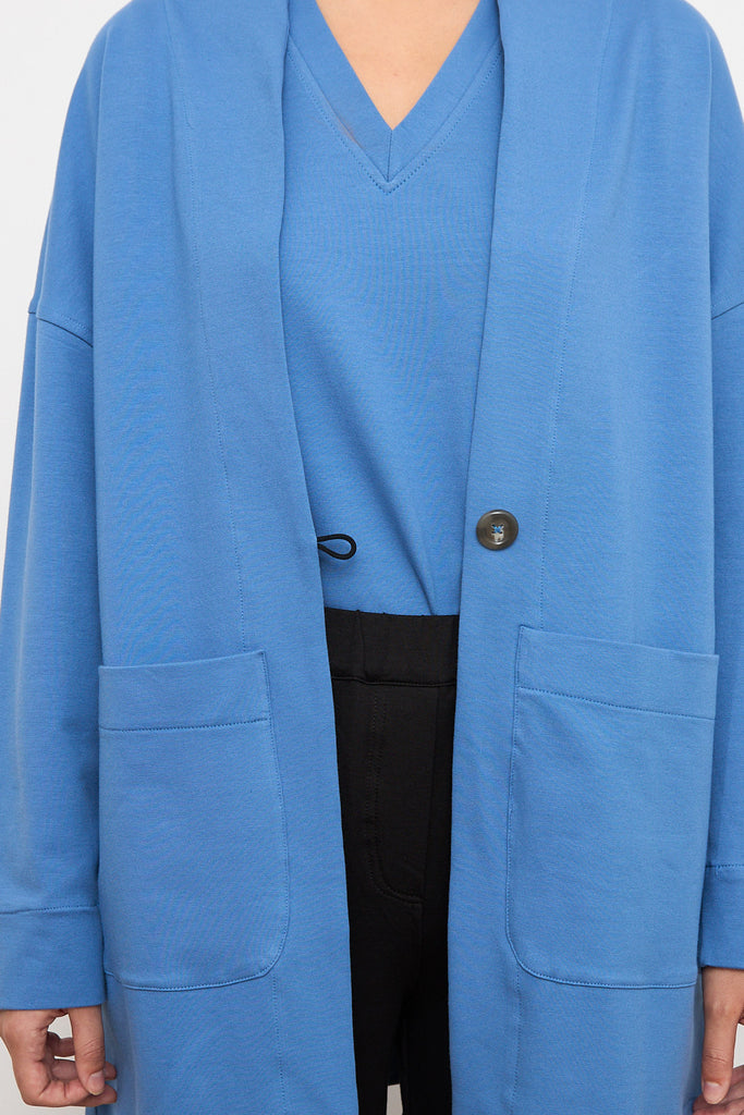 La prenda de abrigo perfecta para un estilo Soft Living sin esfuerzo. Esta chaqueta larga (largo 3/4) en azul eléctrico está confeccionada en algodón suave (95%) para un confort absoluto. Su diseño oversize es cómodo, moderno y versátil, ideal para llevarla sobre cualquier look de la colección.