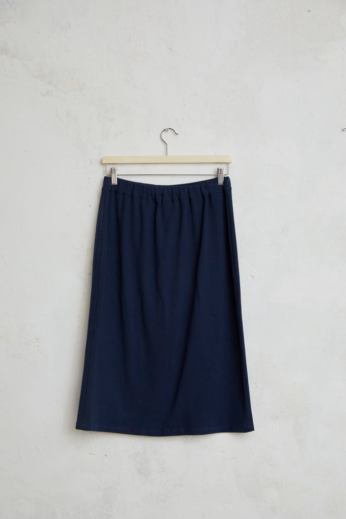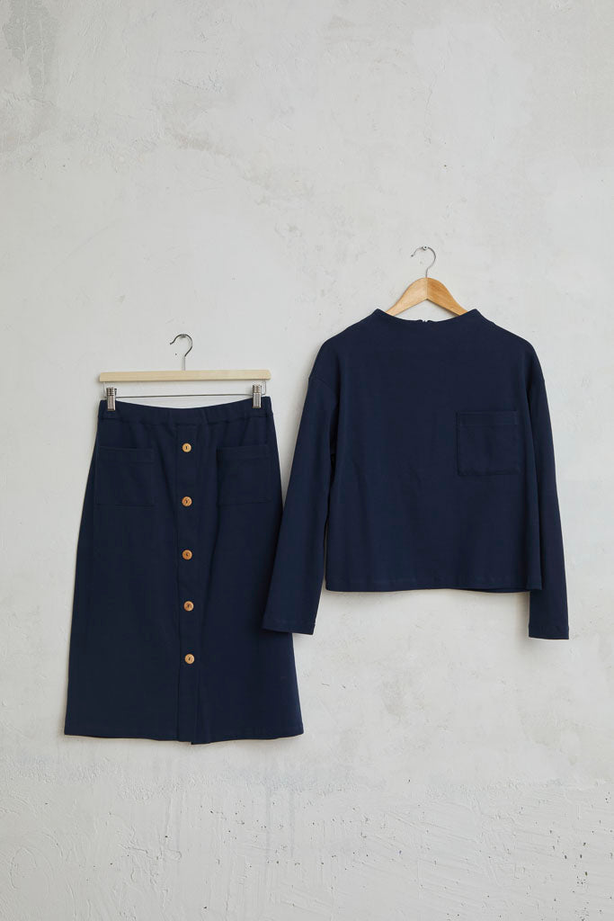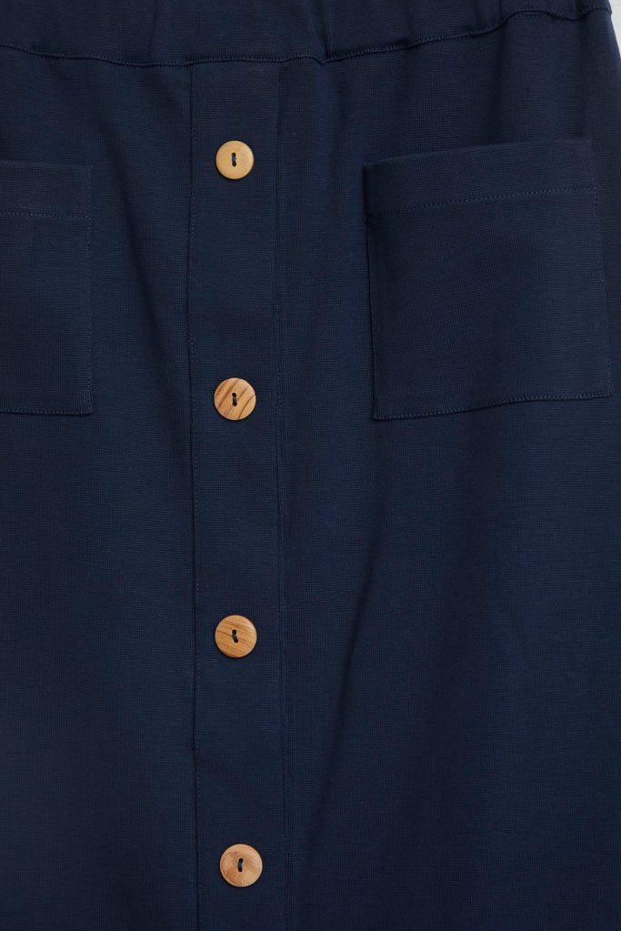 Falda largo midi en azul oscuro y detalle de botones en madera natural. Tejido de punto doble, con textura suave y agradable al tacto. Muy cómoda con goma en la cintura, el SET ideal para llevar con el top del mismo color.