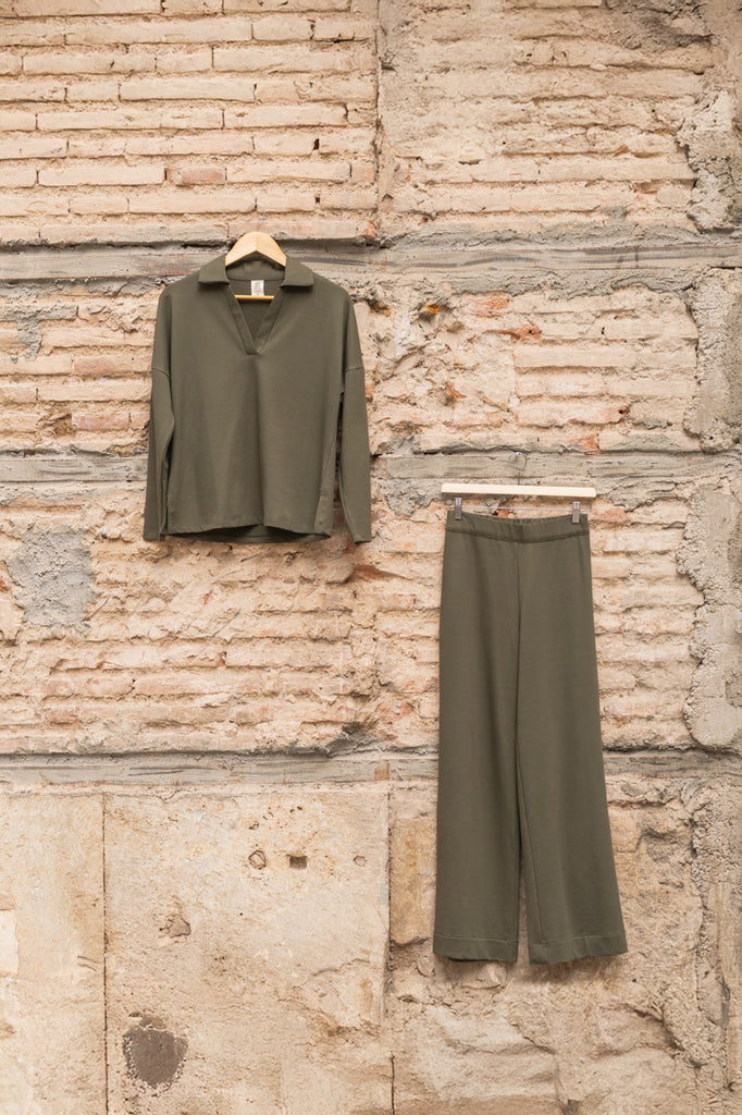 Polo oversize de manga larga en color verde oscuro. Tejido de algodón, con textura suave y agradable al tacto, es muy cómodo para llevar con el pantalón largo o la falda recta del mismo color.