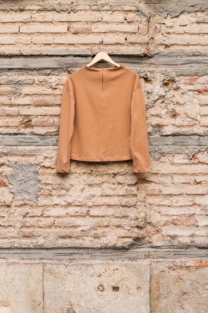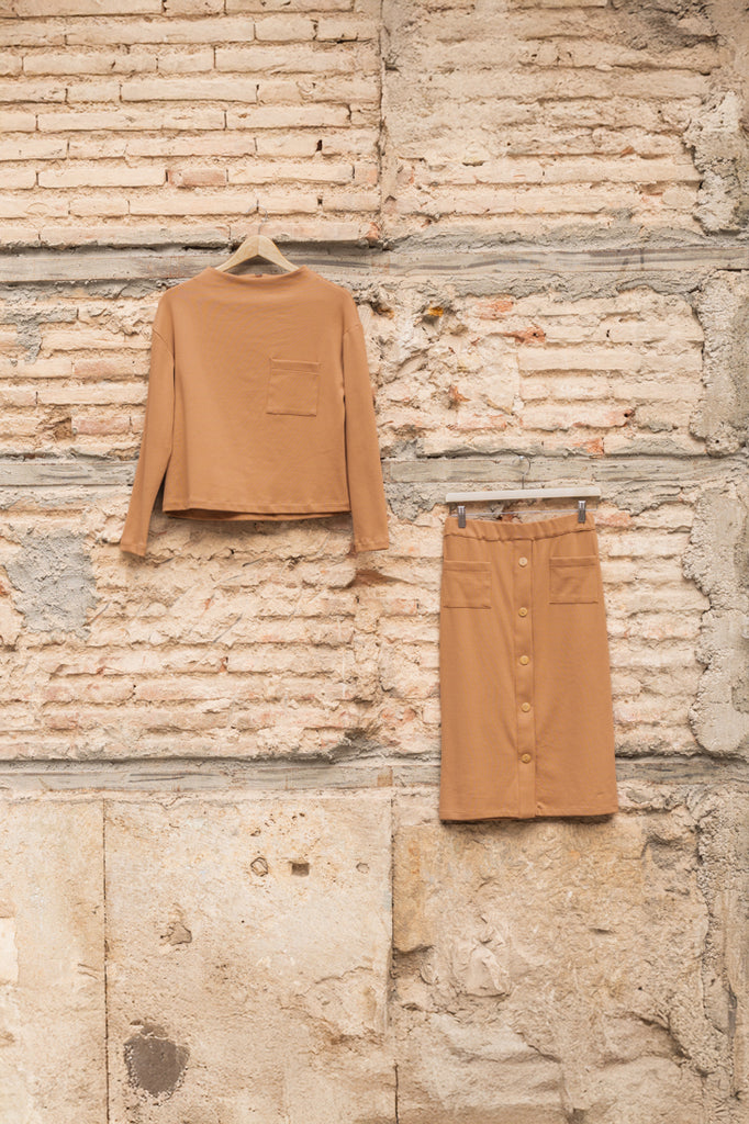 Top con cuello CHIMENEA, cremallera invisible trasera y bolsillo delantero de color beige. Tejido de punto doble, con textura suave y agradable al tacto. De manga larga, muy cómodo para llevar con la falda midi de botones del mismo color.