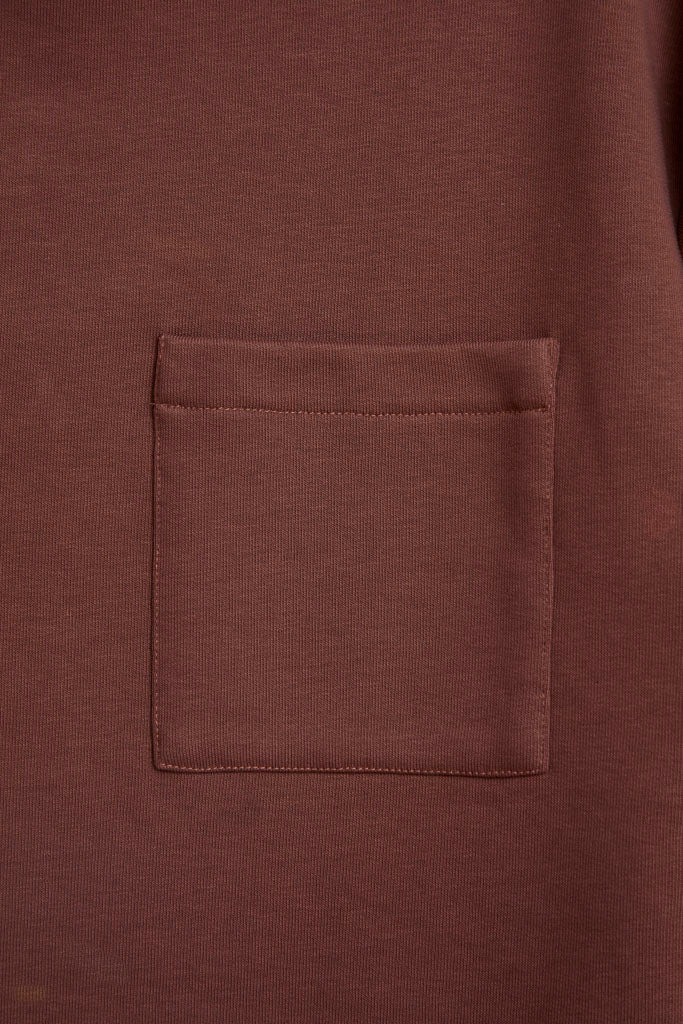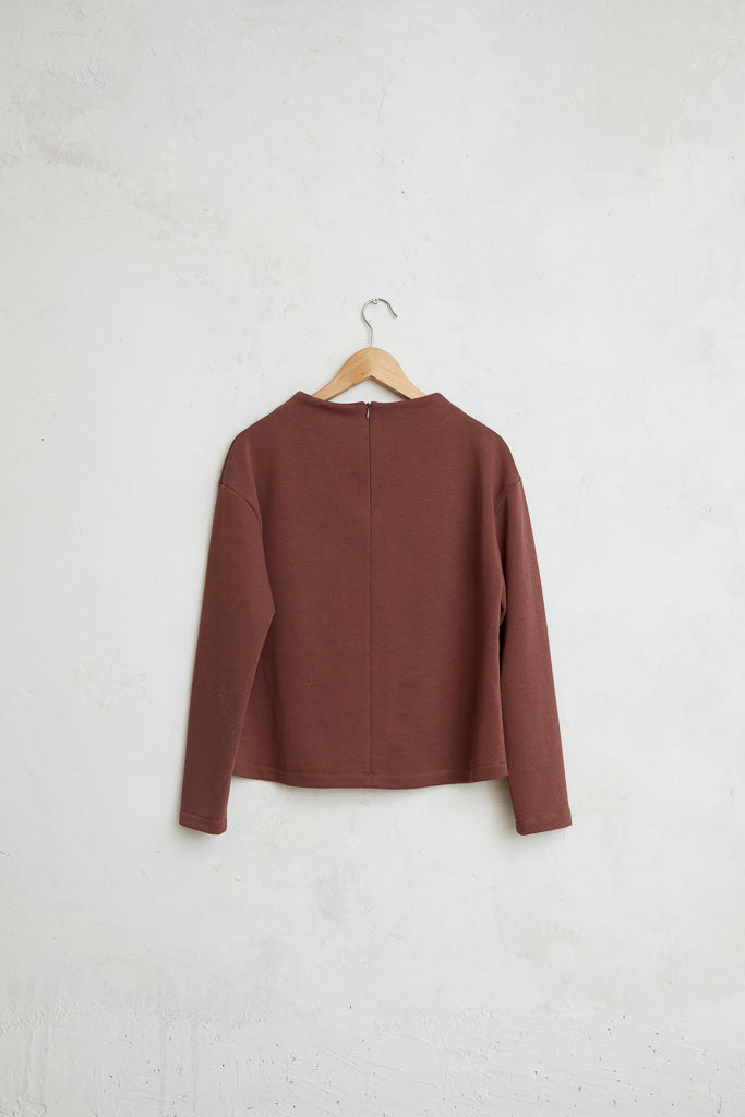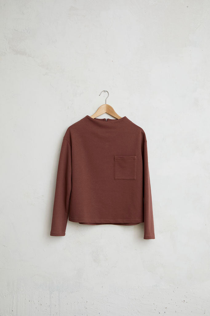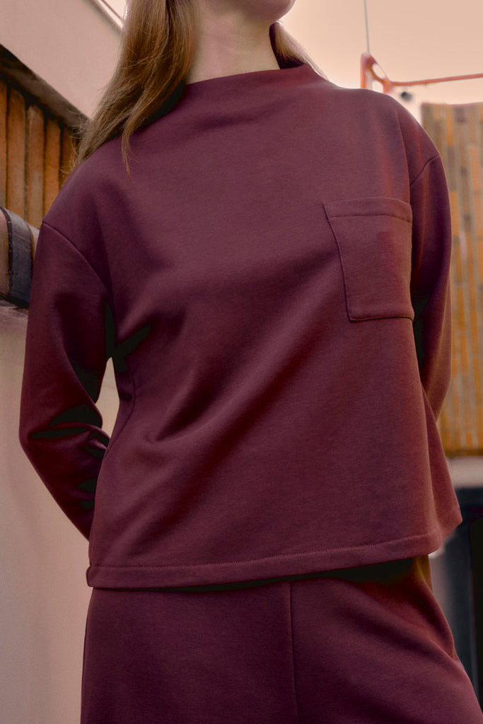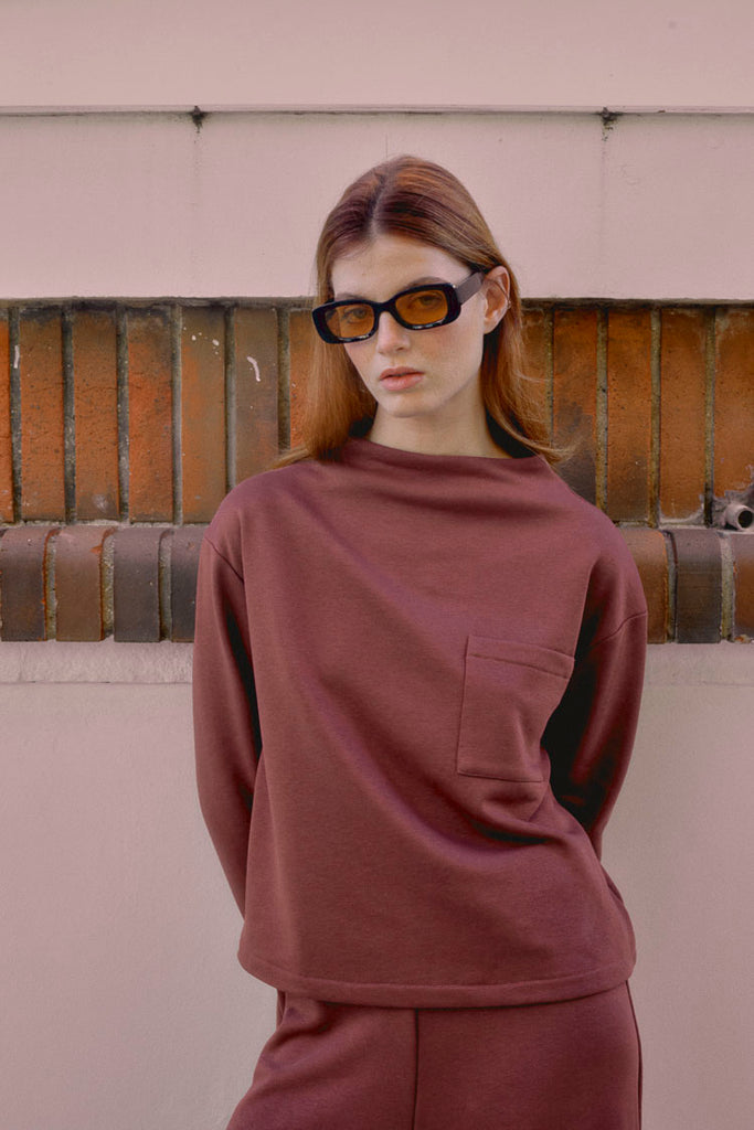 Top con cuello chimenea, cremallera invisible trasera y bolsillo delantero de color berenjena. Tejido tipo sudadera, con textura suave y agradable al tacto. De manga larga, muy cómodo para llevar con el pantalón palazzo del mismo color.