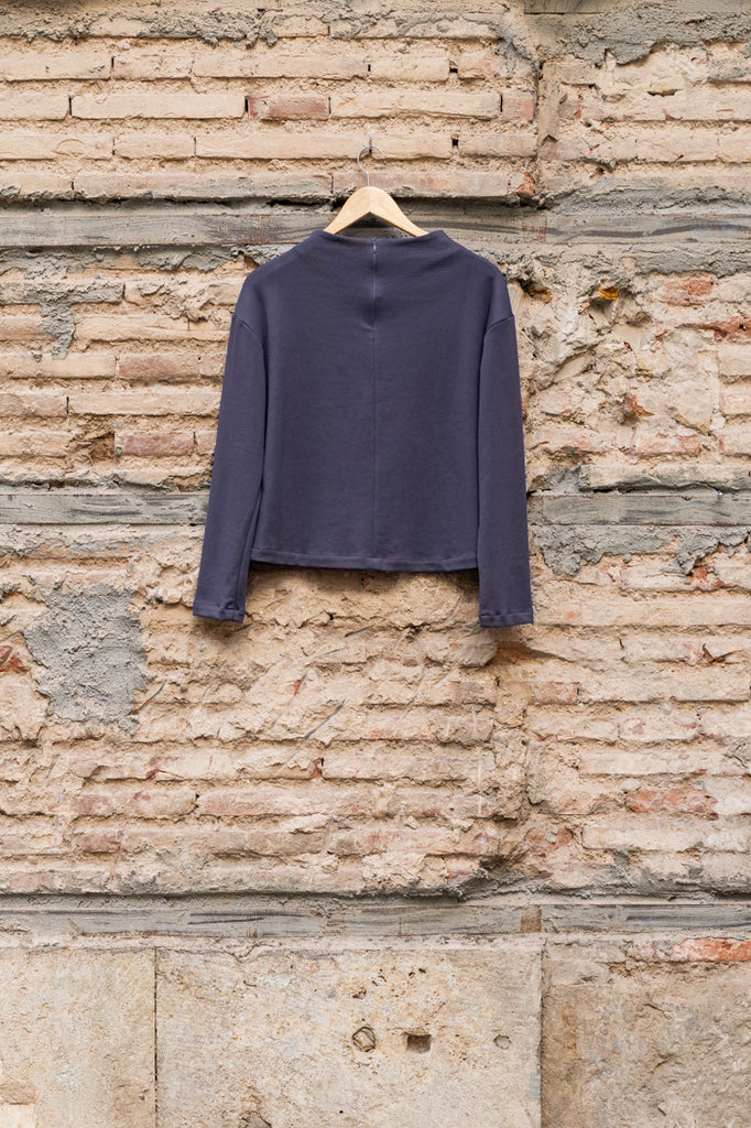 Top con cuello chimenea, cremallera invisible trasera y bolsillo delantero de color gris oscuro. Tejido de punto doble, con textura suave y agradable al tacto. De manga larga, muy cómodo para llevar con el pantalón largo del mismo color.