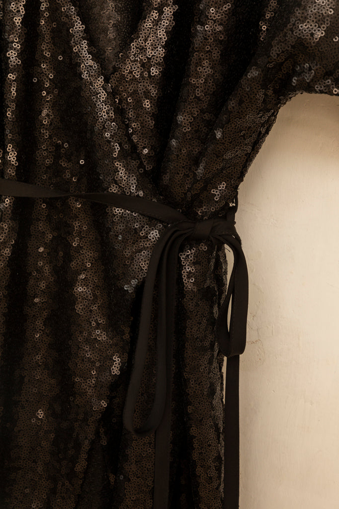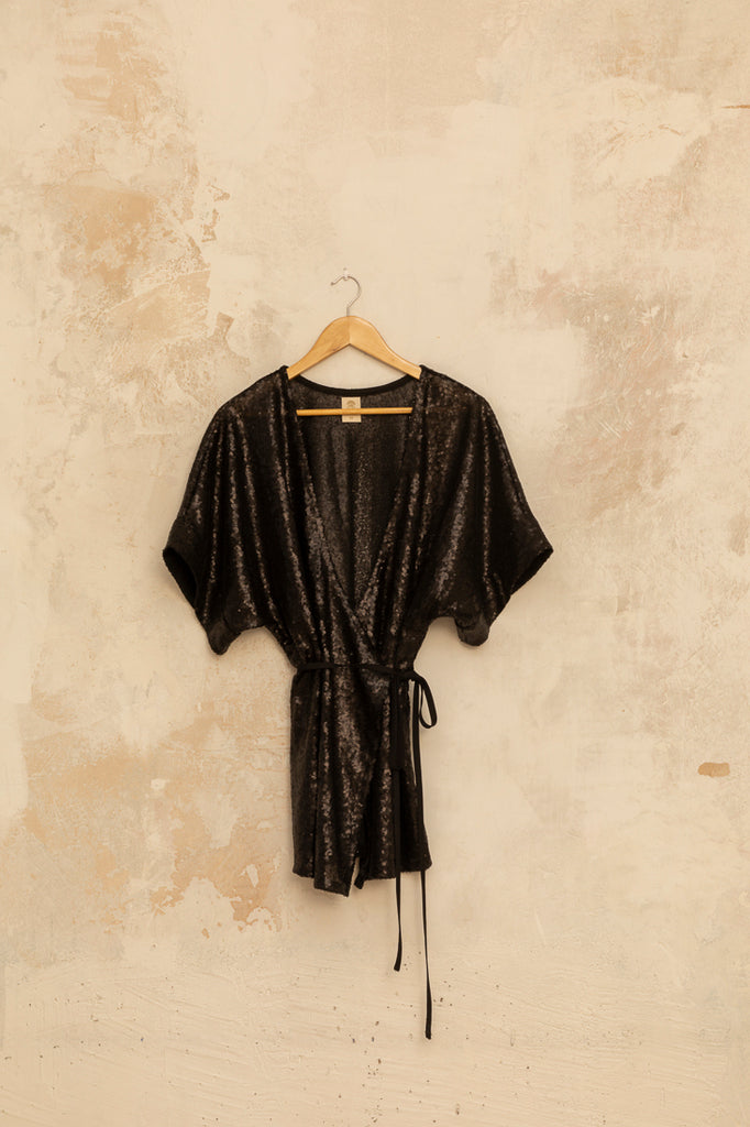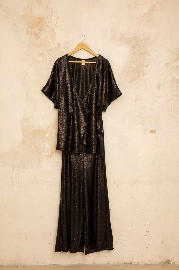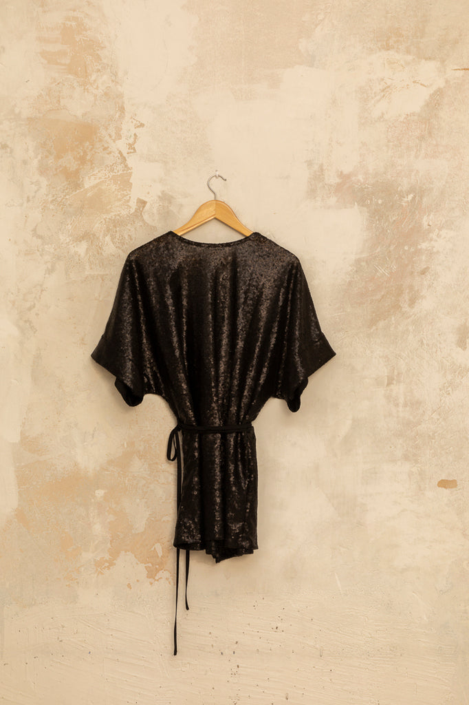 Top kimono de lentejuelas en color negro. Lo puedes llevar sólo o combinado con el palazzo lentejuelas.