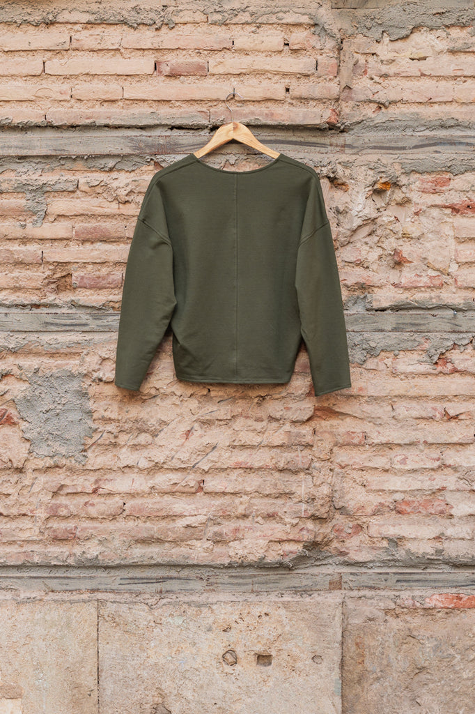 Top con cuello pico en color verde oscuro. Tejido de algodón, con textura suave y agradable al tacto De manga larga, muy cómodo para llevar con la falda larga o el pantalón largo ambos del mismo color.