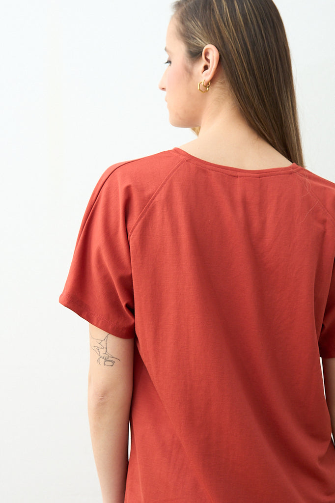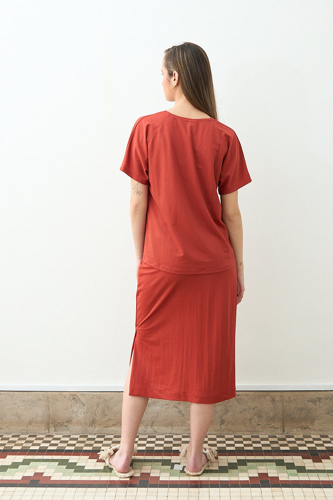 Camiseta de punto de manga corta y cuello redondo de color rojo óxido, sin costuras delante y manga raglan detrás. Ligeramente más larga por detrás. La puedes combinar con la falda del mismo color.