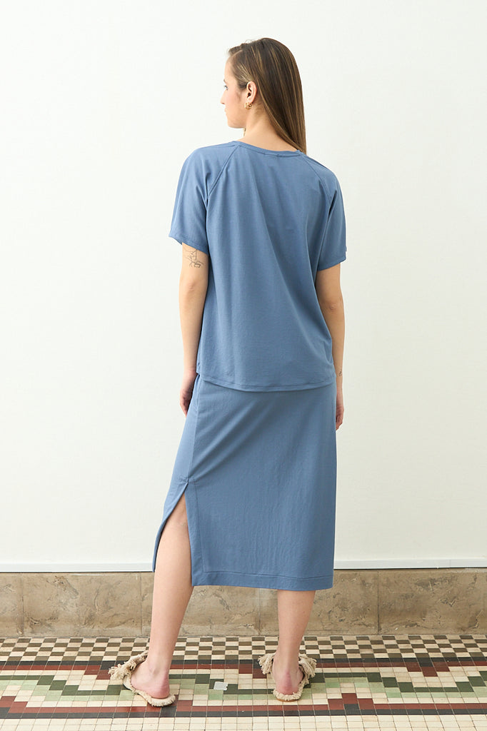 Falda de algodón de largo midi y forma tubo con abertura lateral de color azul acero. Lleva goma en la cintura y es ¡super cómoda!. La puedes combinar con el top del mismo color de manga corta y manga larga.