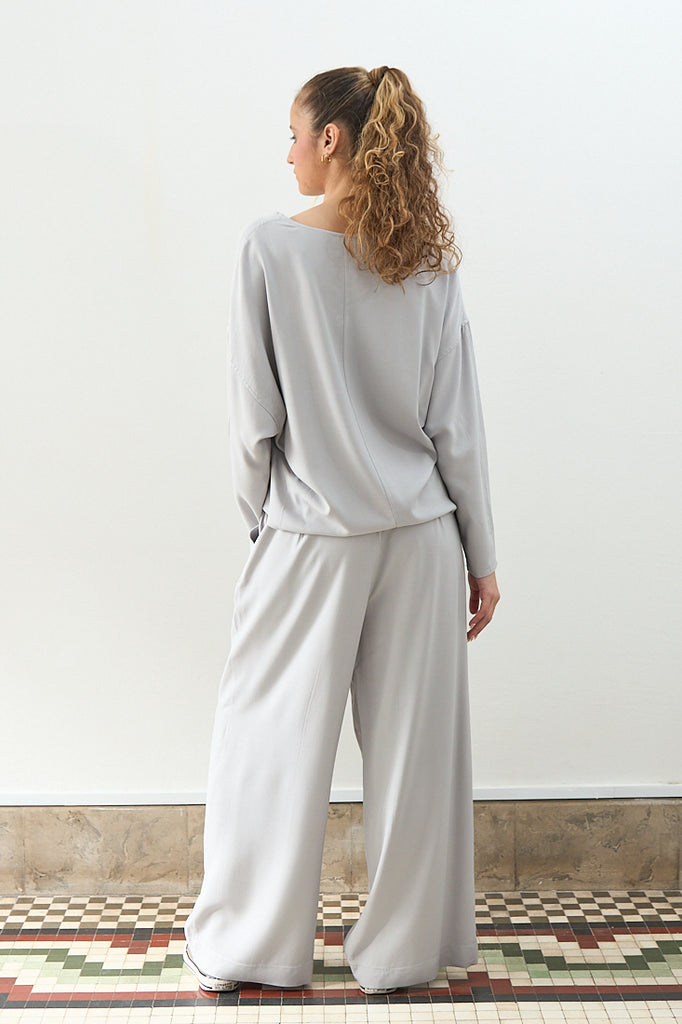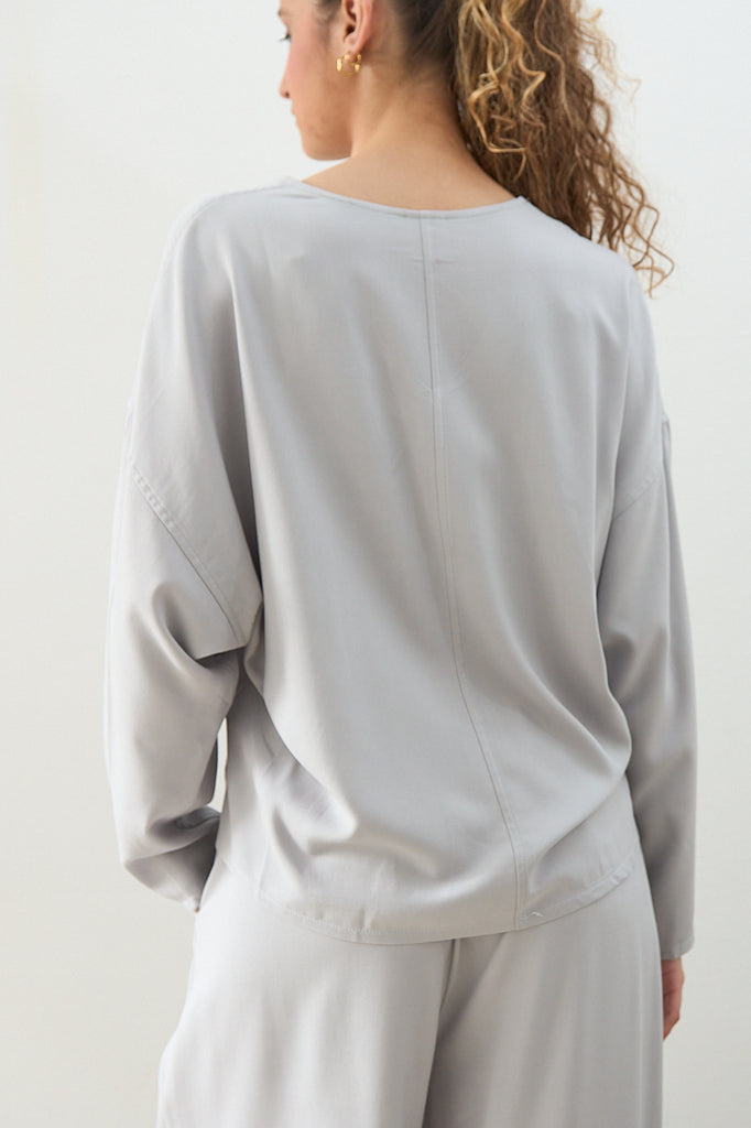 Top con cuello pico en color GRIS PERLA. Tejido con textura suave y elegante caída. De manga murciélago, ideal para llevar con el pantalón del mismo tejido.