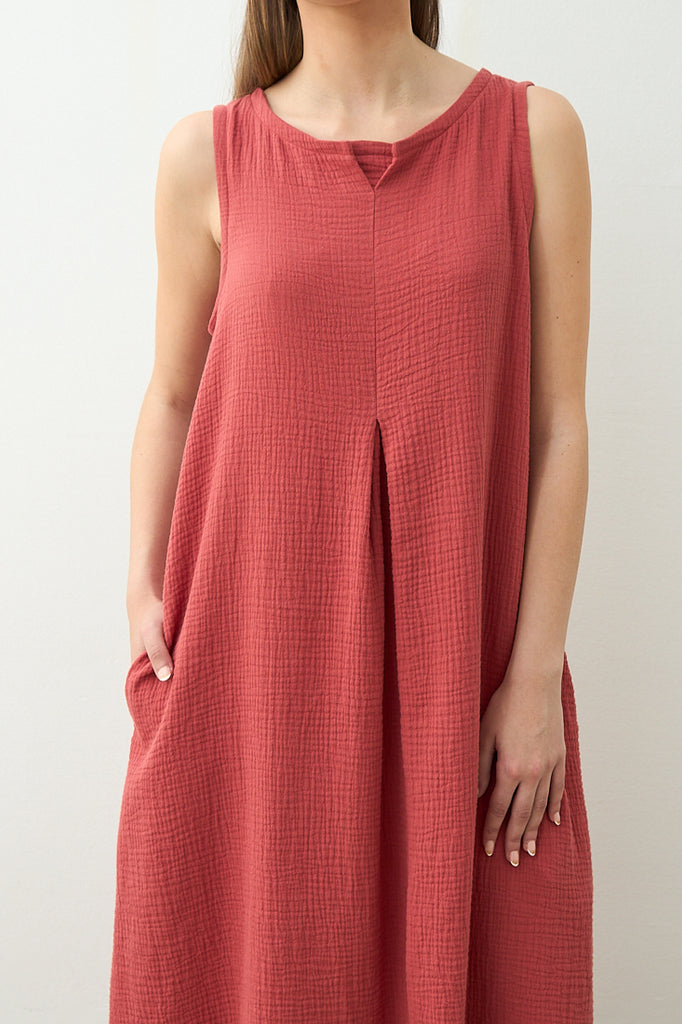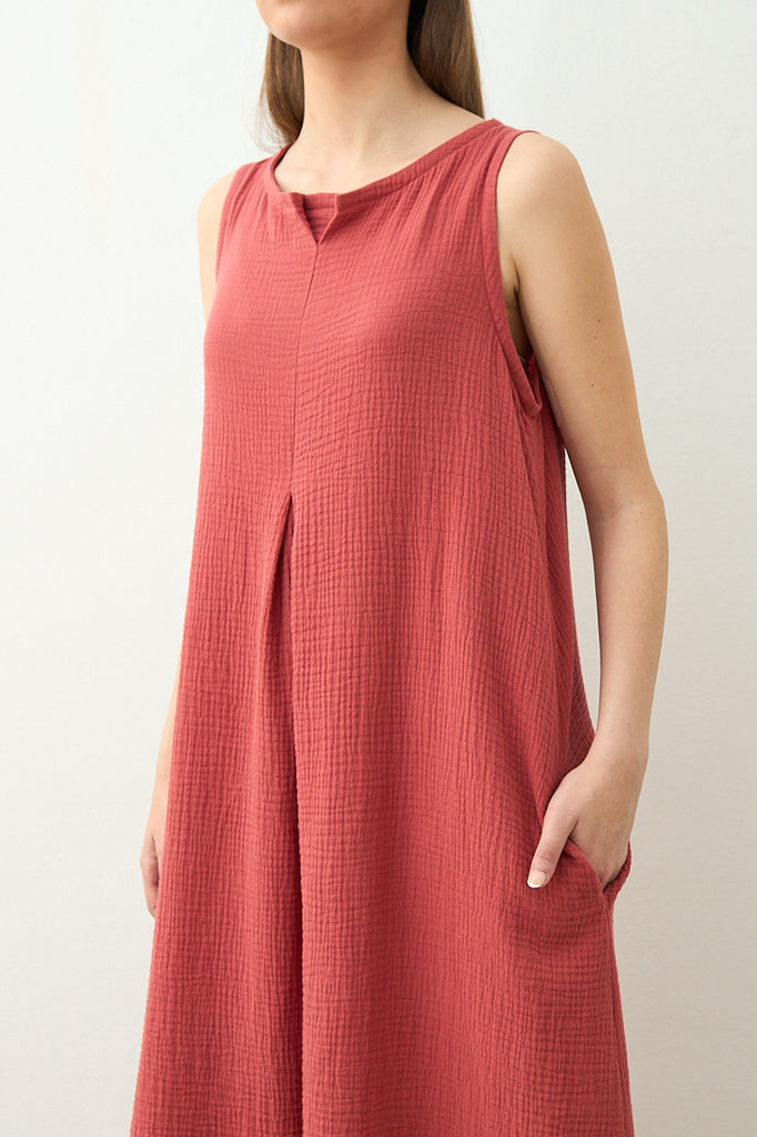 Vestido midi sin mangas con fuelle delantero en color caldera. Tejido de doble gasa ideal para el verano y tiene bolsillos laterales para una mayor comodidad. Tejido 100% natural.
