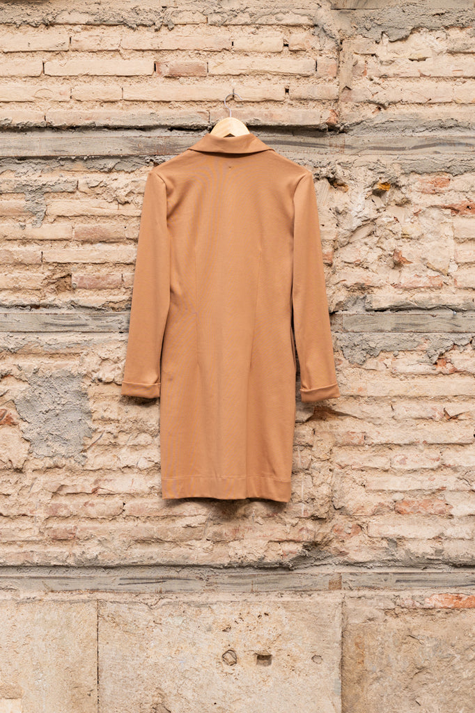 Vestido corto entallado en color beige, con manga larga es perfecto para una tarde de invierno. Lleva botones de madera natural y bolsillos con costura vista. Tejido de punto doble, con textura suave y agradable al tacto.