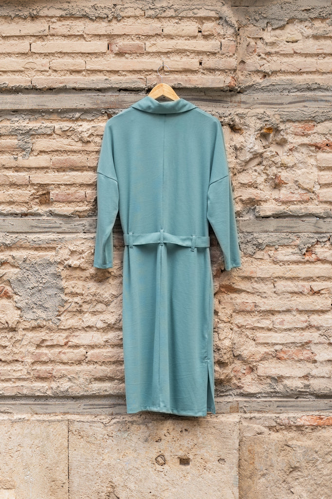 Vestido con cuello polo en color verde agua. Tiene bolsillos delanteros y cinturón para poder llevarlo ajustado o suelto, como más te guste. Tejido de punto, con textura suave y agradable al tacto.